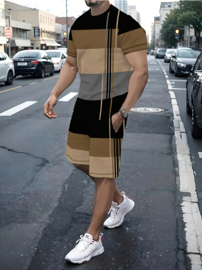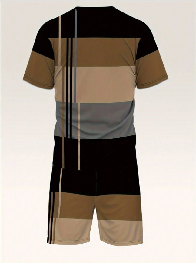 Men Fashionable 2 Pieces Set - Striped Short Sleeve T-Shirt & Drawstring Shorts - Comfortable Color Matching Outfit For Outdoor Adventures And Casual Wear