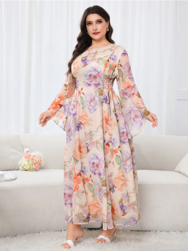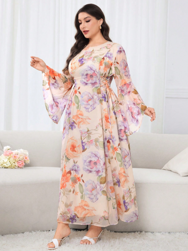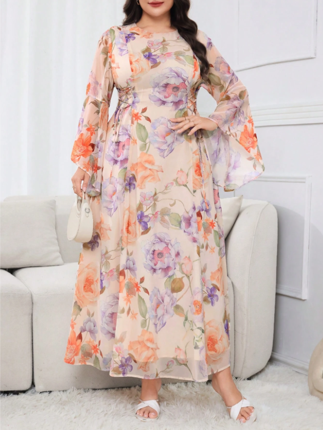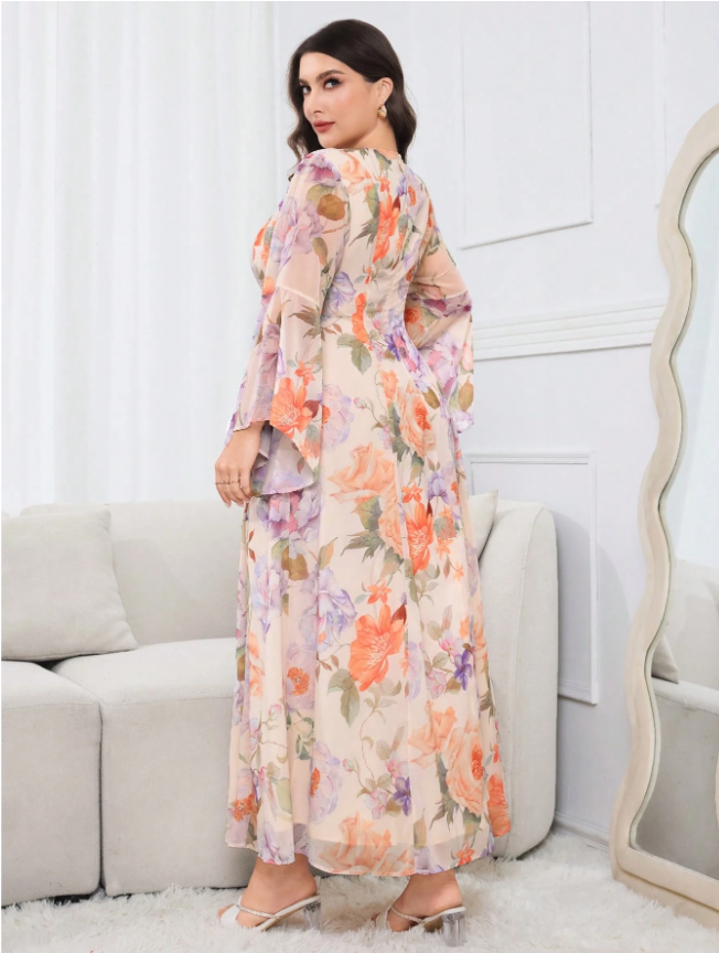 Veilorie Plus Size Elegant Floral Print Flare Sleeve Dress